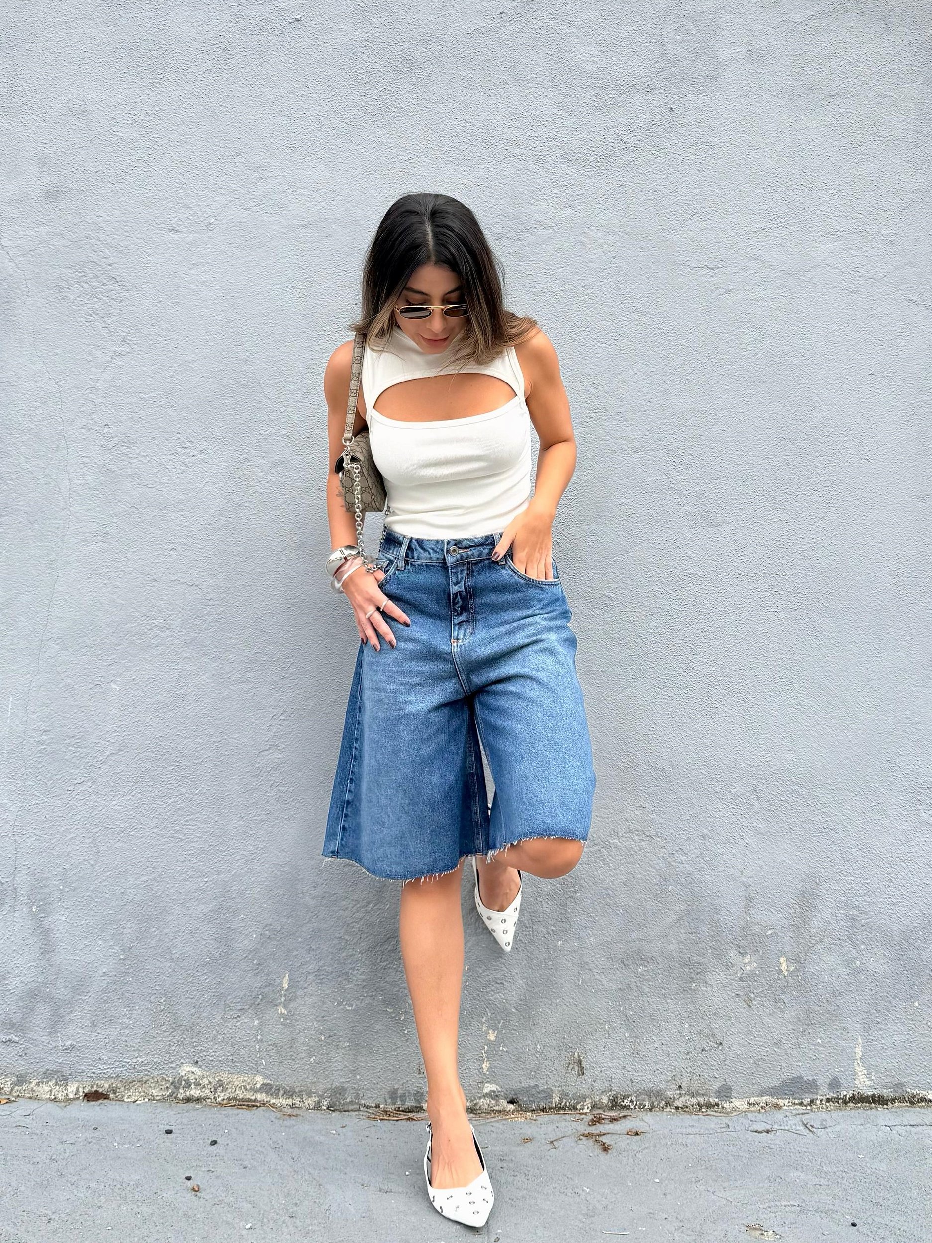 Modelo de regata no canelado com elastano e detalhe de recorte frontal.